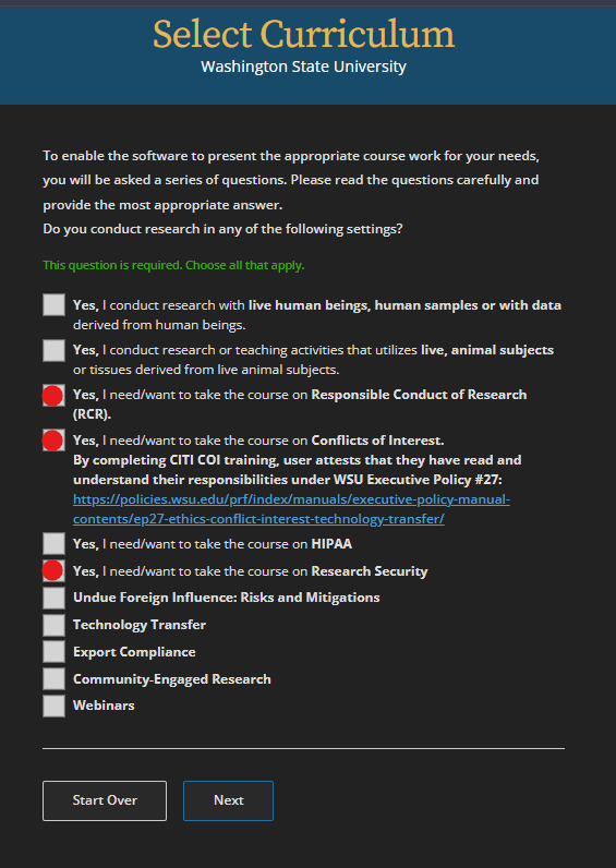 - Select all options that apply to you. The courses with the red indicators in the image below are the three courses required for all WSU Researchers.
