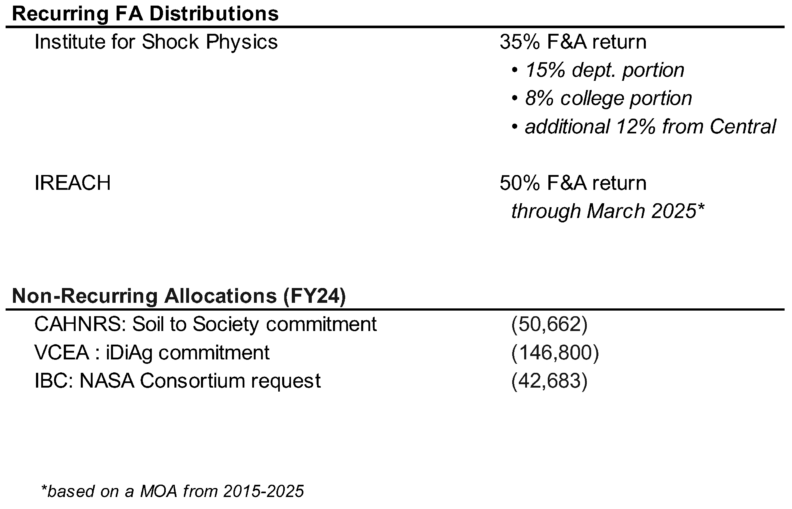 The table below provides more detailed F&A data from FY24 actual allocations and FY25 estimated allocations.