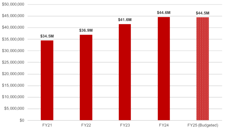 F&A revenues shown in USD. FY21 through FY24 reflect actual F&A revenues recorded in the WSU Indirect Cost Recovery fund in Workday Finance. FY25 is the initial F&A budget based on prior year actuals. A contingency is budgeted to mitigate against unrealized revenues. Additional one-time funding allocations are made from carryforward funds set aside for strategic use.