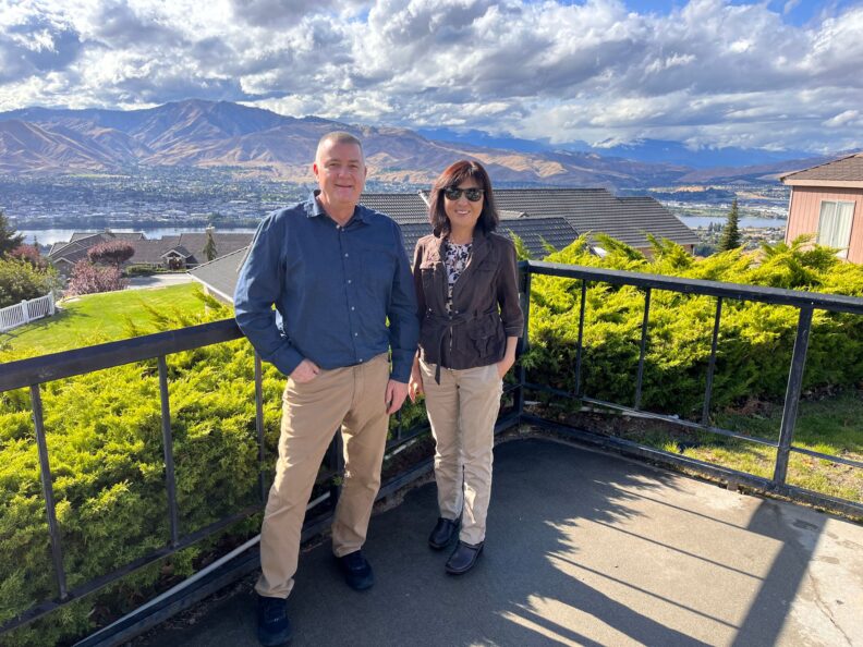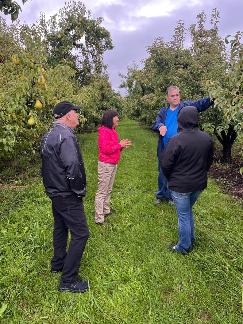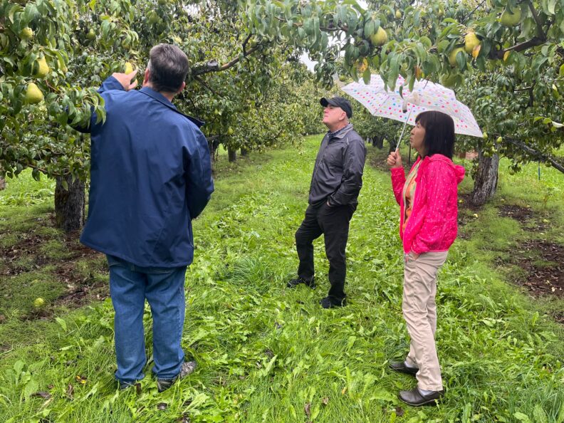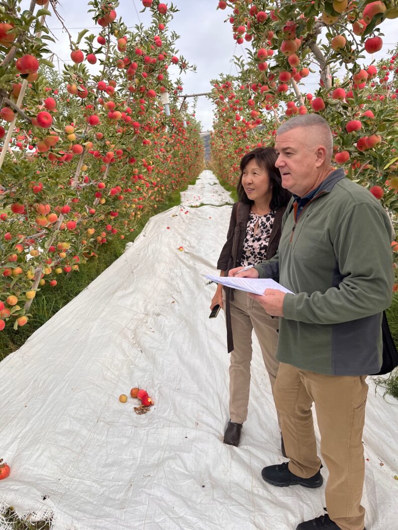 Ruihong Guo, deputy administrator for Science & Technology, and Jeffrey Haynes, commissioner for the PVPO, met with Jeremy Tamsen, director of Innovation and Commercialization for the College of Agricultural, Human, and Natural Resource Sciences, and Deah McGaughey, technology licensing associate, at CIOPORA this last May and reached out to connect on a visit. CIOPORA is a community of breeders of asexually reproduced horticultural plants and actively contributes to the development of effective systems of Plant Variety Protection (PVP) worldwide. Trees and shrubs are new to the PVPO for protection. Guo and Haynes visited several Washington apple orchards to learn about the different growing systems, as well as take in-person notes about leaf, fruit and tree attributes.
